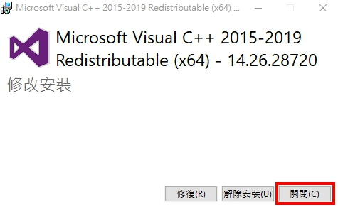 4. 出現「修改安裝」, 即安裝過此驅動, 點擊「關閉」